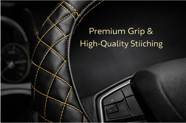 Upgrade your driving experience with our Premium Diamond Quilted Steering Cover, designed for style, comfort, and superior grip. Crafted with high-quality leatherette and elegant gold cross-stitch detailing, this steering cover adds a bold luxury statement to your car interior.